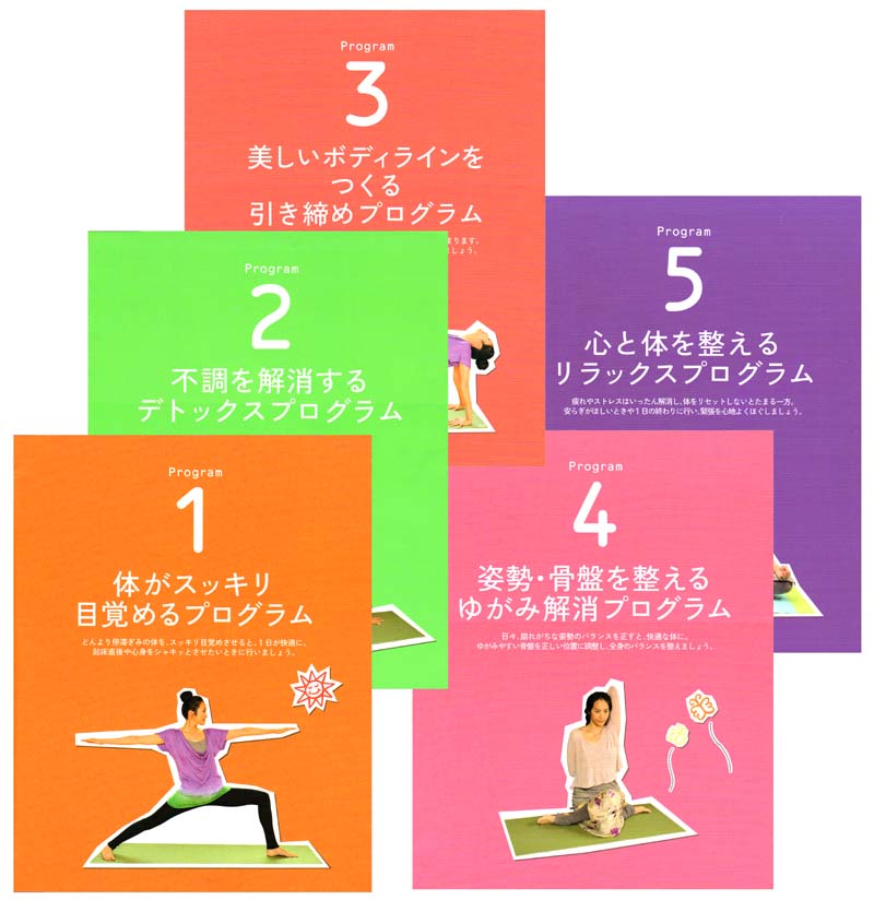 本書はProgram1体がスッキリ目覚めるプログラム、Program2 不調を解消する デトックスプログラム、Program3 美しいボディラインをつくる 引き締めプログラム、Program4 姿勢・骨盤を整える ゆがみ解消プログラム、Program5 心と体を整える リラックスプログラム 以上5つのプログラムを用意。どれも10〜15分程度のシンプルなものです。体調や気分に合わせて楽しんで。