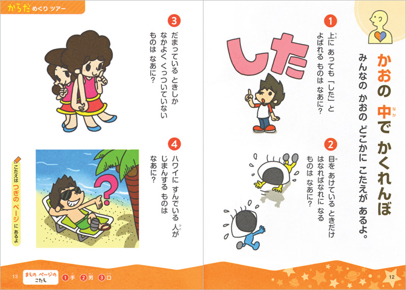 「上に あっても “した”と よばれる ものは なあに?」(=口の中のべろ)、「だまっている ときしか なかよく くっついていない ものは なあに?」(=くちびる)など、身近なものをテーマにしたなぞなぞだから、ものの名前をどんどん覚えられるよ。頭の体操にもちょうどいいね!