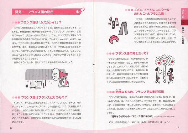 フランス語は難しくて…と、思っていませんか? たしかに、beaujolais nouveauをどうやって「ボジョレ・ヌヴォー」と読むかなんて見当もつかないですし、名詞に性が存在することも違和感を覚えますよね。でも、フランス語はわかりやすい言語で、基本的な発音や文法項目を押さえれば、霧が晴れたように理解できるようになるのです。さあ!「初歩の初歩」と一緒に、はじめの一歩を踏み出しましょう!